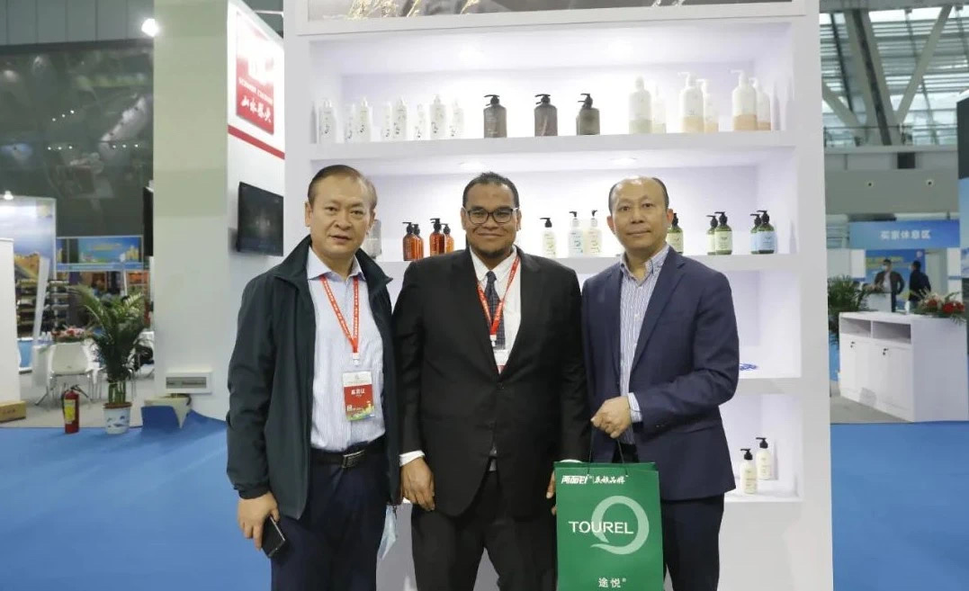 ca88唯一公司党委书记、董事长林钻煌(左三)向马来西亚驻南宁总领馆总领事阿兹利米(右一)介绍ca88唯一中药日化产品。