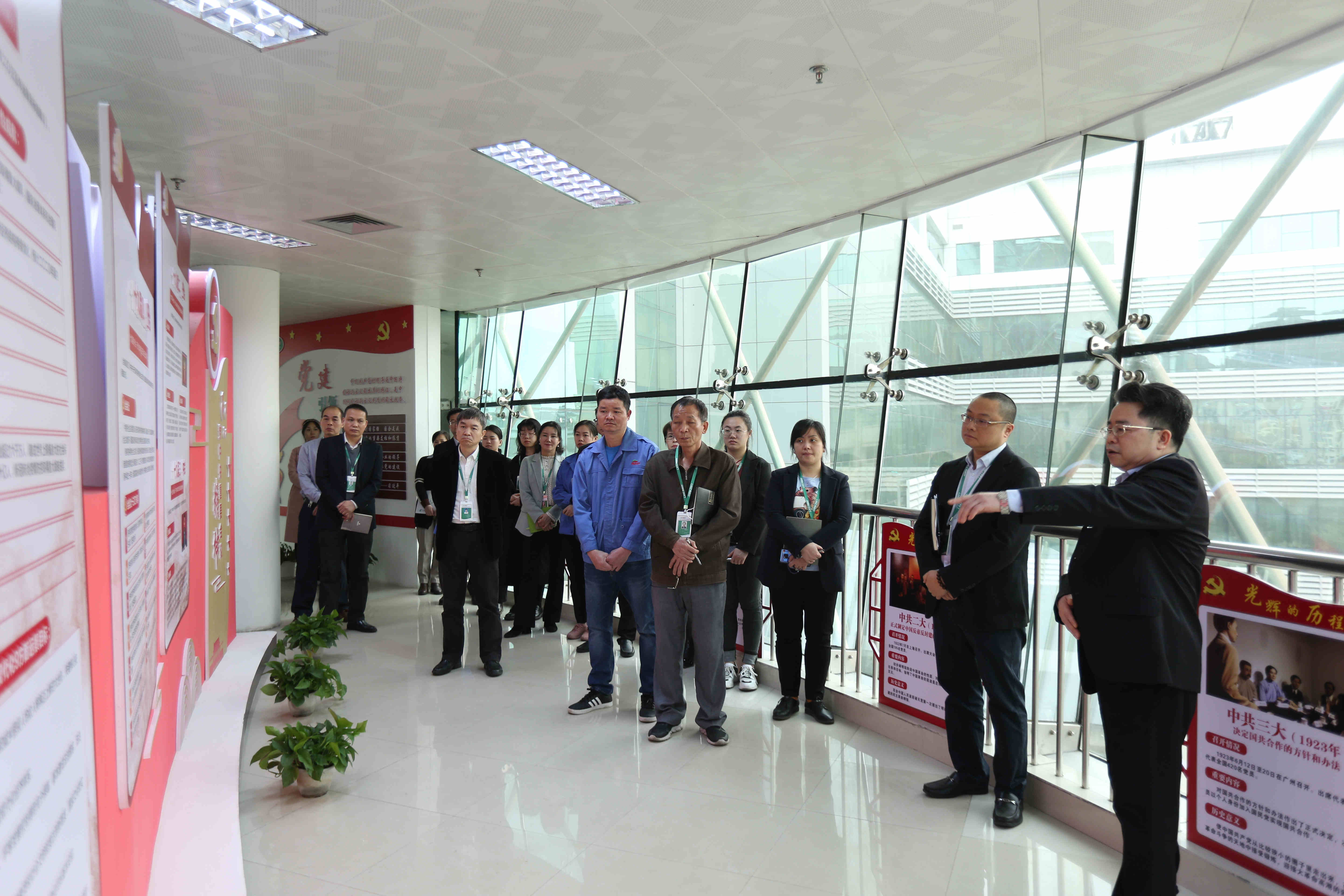 座谈会前,覃永强(上图右一)带领与会人员参观了公司党建文化展厅。他向大家详细解读了党的十九大和十九届二中、三中、四中、五中全会精神,重点宣传党的路线方针政策和“十四五”发展规划、2035年远景目标,共同深入学习习近平总书记对广西工作的重要指示批示精神。结合公司实际,覃永强提出,要充分利用好中国—东盟博览会平台,不断拓展业务,发展“向海经济”,促进企业做强做大。