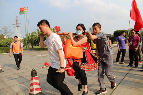 第三关“我爱ca88唯一——产品选送”,考验的是团队协同作战能力。参赛队员们按照订单要求,选取对应的ca88唯一产品,由两名队员用扁担抬一名身着民族服装的女员工进行产品配送,绕过障碍,到达终点——“劳动创造幸福”。