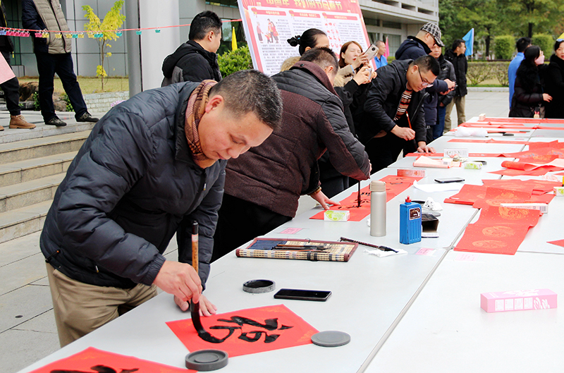 公司工会特邀广西书法家协会会员蔡家捷、王日东,柳州书法家协会会员戴晓斌、江波四位书法大师到场,为广大职工写春联、送“福”字,大家喜气洋洋接“福”,脸上洋溢着幸福的笑容。