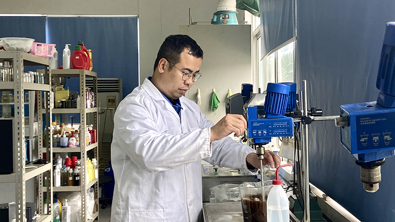 作为技术主管,团队带头人,他始终保持着热爱本职工作的赤诚之心,面对困难,他主动出击、勇于担当、积极表率。2015年,有位客户需要开发食品级的果蔬清洁剂,甚至要求这款清洁剂不仅可以“喝”,还要不能有任何刺激或者难受的味道。对于这一系列难度系数大的要求,他没有抱怨,也没有退缩,而是主动担当重任,不断的选用食品级、安全、天然、无毒的原料进行产品开发,甚至带头以身“尝试”样品,最终按客户要求完成任务,得到了客户的认可。