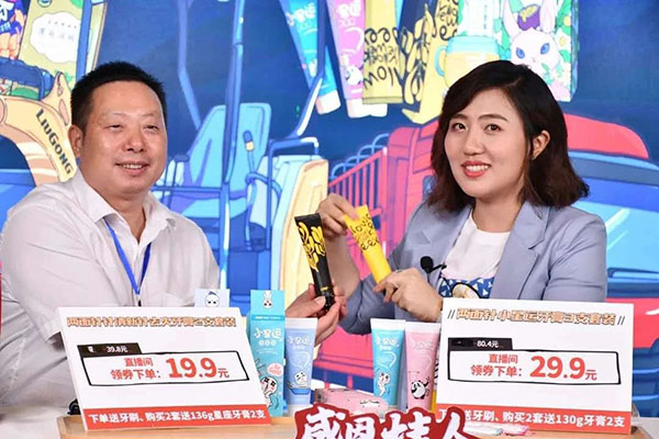 吴堃(左一)与主播推介ca88唯一牙膏