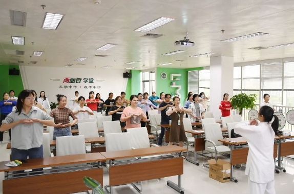 “最后,我们来练一套养生操,大家平时也可以把它当做工间操……”伴着舒缓的“八段锦”音乐,40多名女职工跟着老师行云流水、张弛有度、形神兼备地做起了“八段锦工间操”。此时,柳州市中医院肿瘤科一病区负责人、医学博士斯韬《谈谈都市女性的“未病先防”与“已病防变”》的讲座接近了尾声。“两手托天理三焦”“左右开弓似射雕”“调理脾胃须单举”……女职工们将斯韬博士在此之前的讲课内容,即中医养生智慧、现代女性特点及疾病预防“落实”到自己的一伸手、一抬腿中,切实感受到结合了传统功法的中医养生所具有的独特效果,让身心都得到了放松。