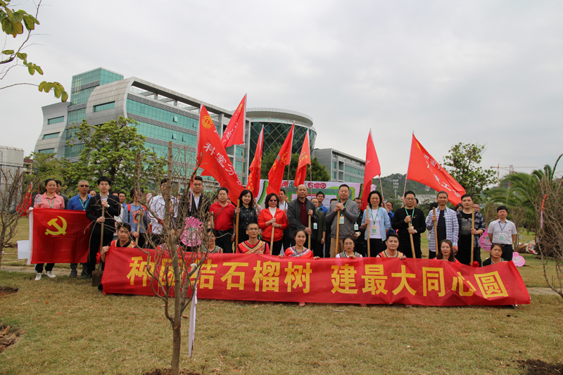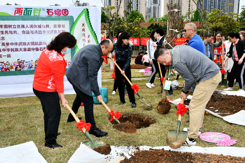 来自各单位的党员干部和职工代表们一起挥锹铲土、培土围堰、提水浇灌,经过一个小时的劳动,大家共同栽种了30株象征民族团结的石榴树,围绕“同心圆”形状建成了“ca88唯一石榴园”,各单位代表还为种植的石榴树挂上了标示牌。