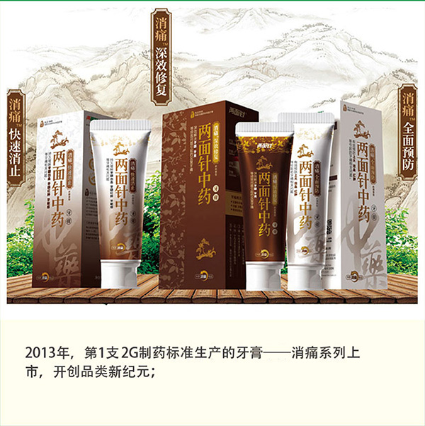 2013年,第一支2G制药标准生产的牙膏——中药消痛系列上市,开创品类新纪元。
