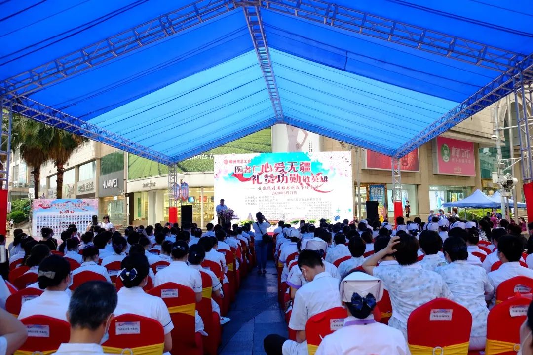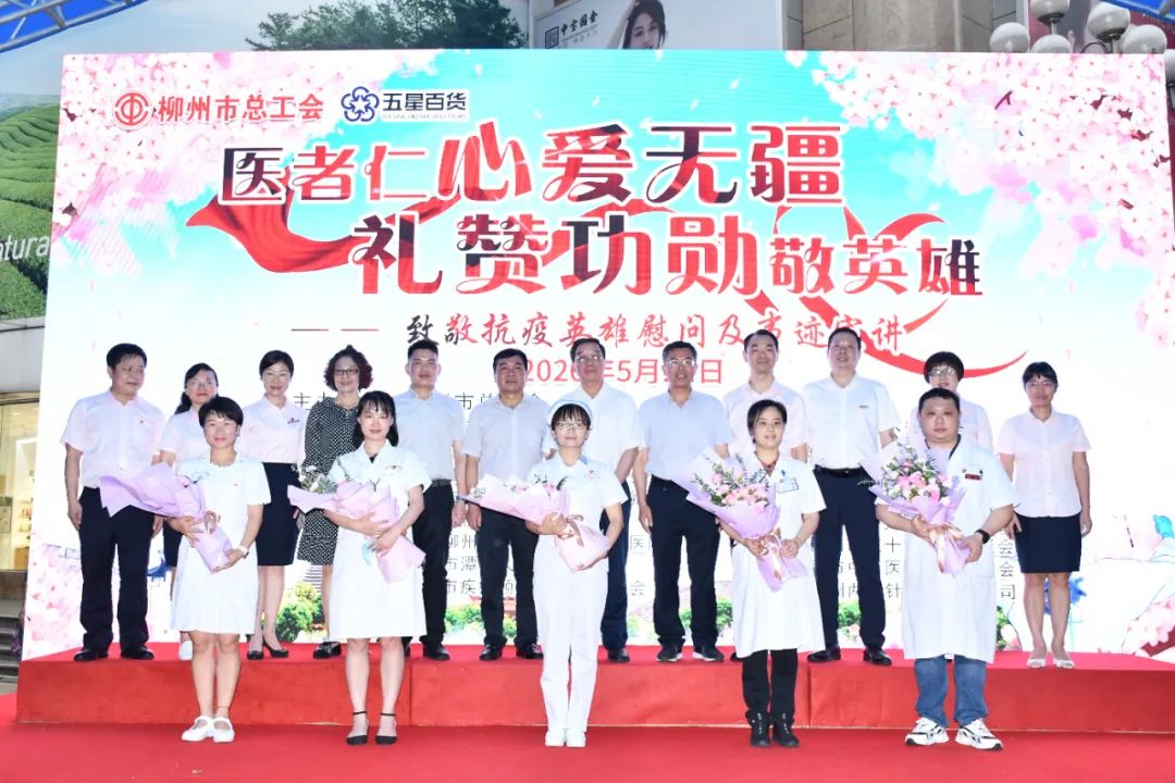 5月21日下午,在柳州五星商业大厦前,柳州市总工会、柳州市财贸工会、柳州五星百货股份有限公司联合举办援鄂医护队员抗疫事迹公益宣讲活动,向抗疫一线医护人员致敬。